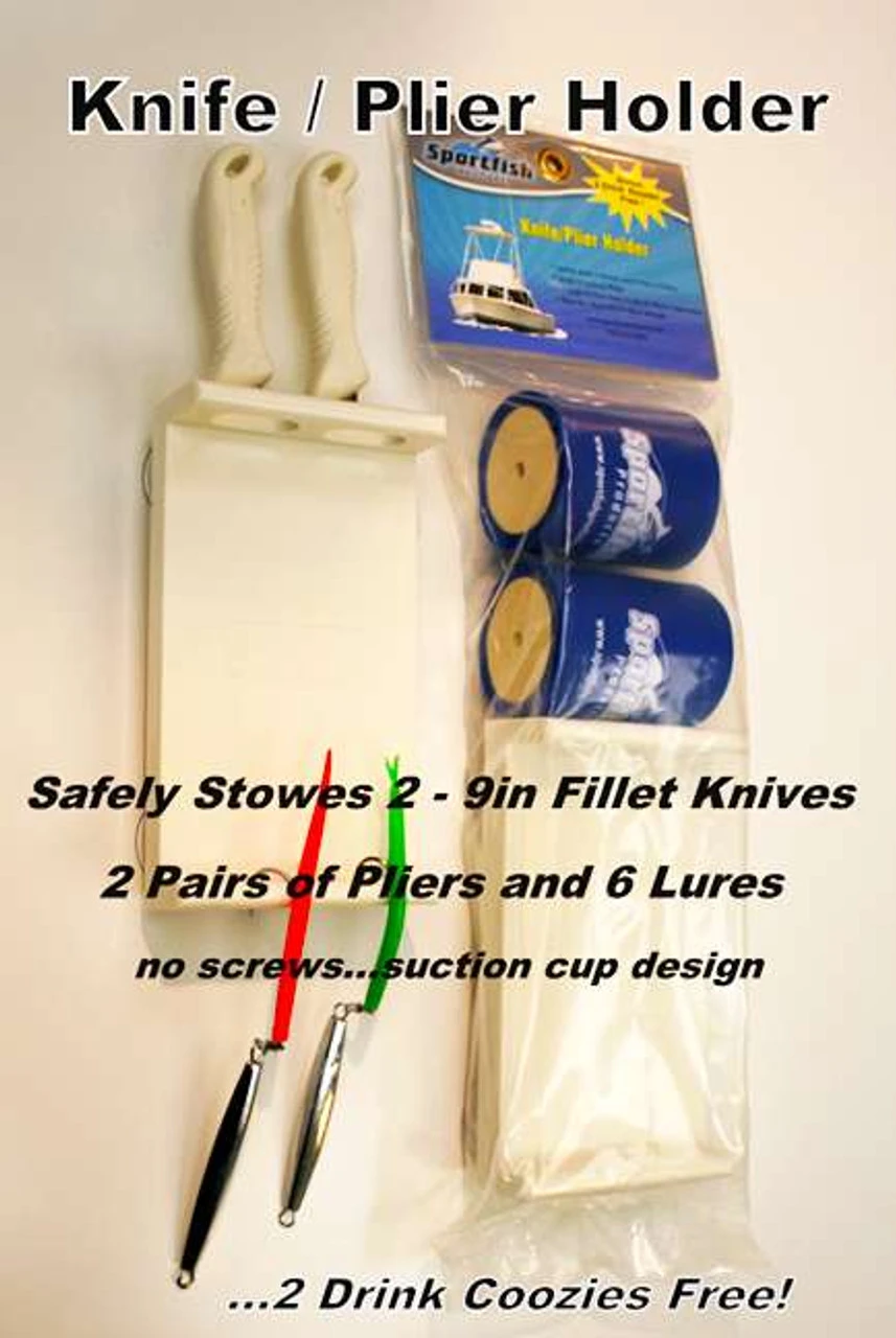 Our Knife / Plier Holder holds up to 2 – 9inch Fillet Knives and 2 pairs of pliers. Knife blades are inside the holder for stowing when not in use. Also holds 6 Lures, Jigs or Spoons. Sturdy plastic construction with suction cup design for easy stowing when not in use. Comes with 2 drink Koozies included Free! Check out our Lure / Plier Holder also.