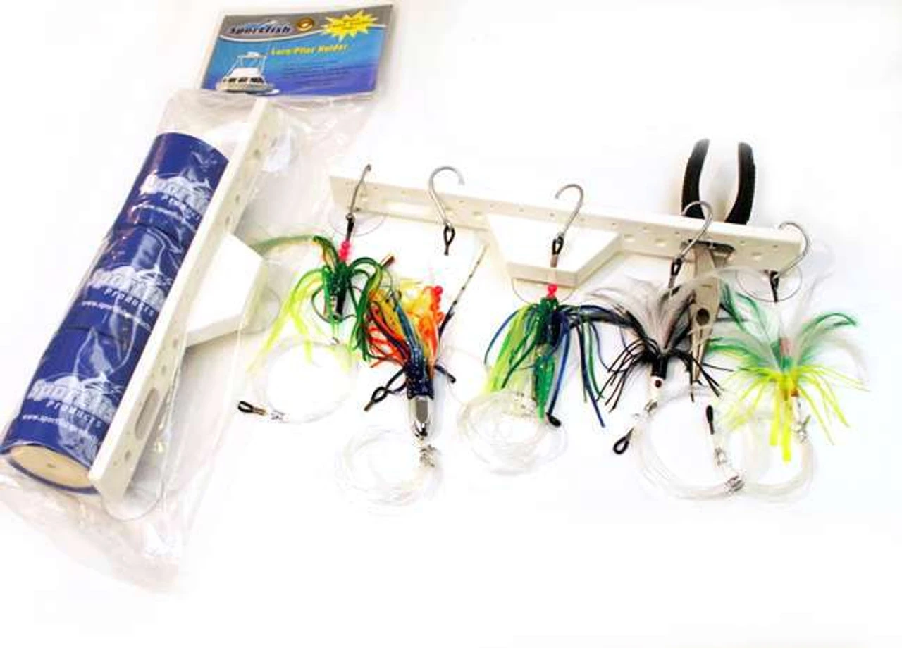 Our Lure / Plier Holder holds up to 21 Jigs, Lures or Spoons and 2 pairs of pliers. Sturdy plastic construction with suction cup design for easy stowing when not in use. Comes with 3 drink Koozies included Free! Check out our Knife / Lure Holder also.